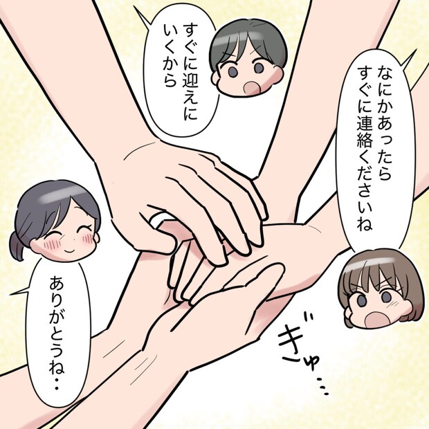 「なにかあったらすぐに連絡くださいね。」「すぐに迎えに行くから。」約束する私たちに「ありがとうね」と義母。私たちはお互いに両手をギュッと握り締めました。