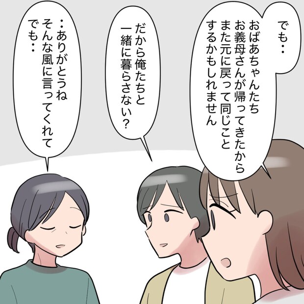 義祖父母も義父も、以前と比べたら義母のことを気づかい自分のことは自分でするようになってきたとはいえ、義母が戻ったらまた同じことをするかもしれないと私は心配していました。「俺たちと一緒に暮らさない?」とともやも誘いましたが、義母は「ありがとうね、そんな風に言ってくれて。でも・・」義母は少し間をおいて言いました。