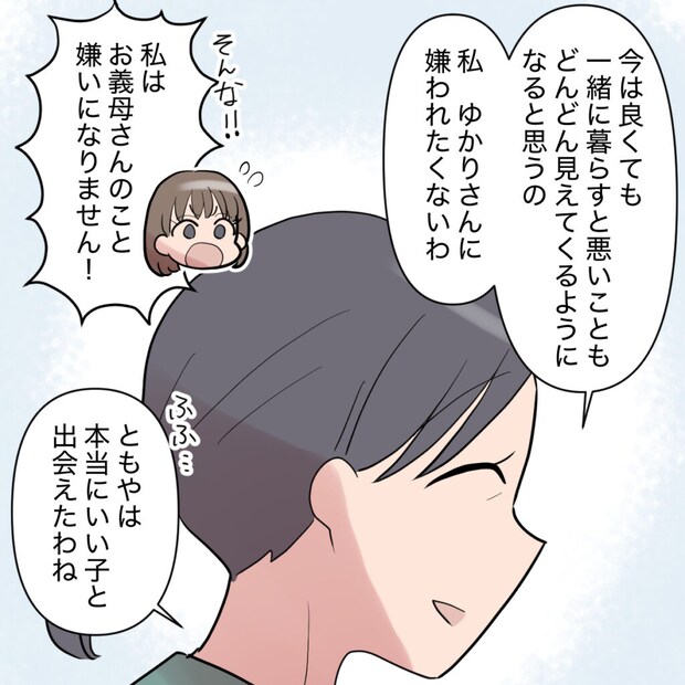 「今は良くても、一緒に暮らすと悪いこともどんどん見えてくるようになると思うの。私、ゆかりさんに嫌われたくないわ。」と義母は言いました。「そんな!私はお義母さんのこと嫌いになりません!」私はキッパリ言いましたが「ともやは本当にいい子と出会えたわね。」と義母はほほ笑むだけでした。