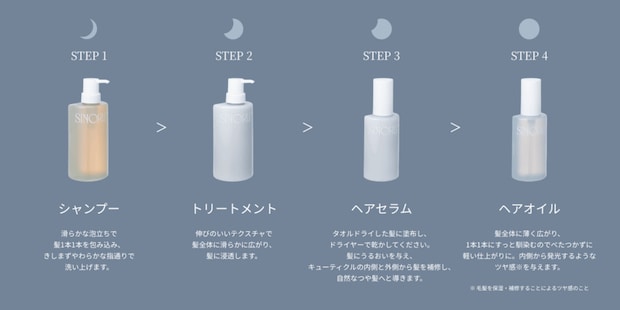 左からシャンプー、トリートメント、セラムにオイル。この順で使います。