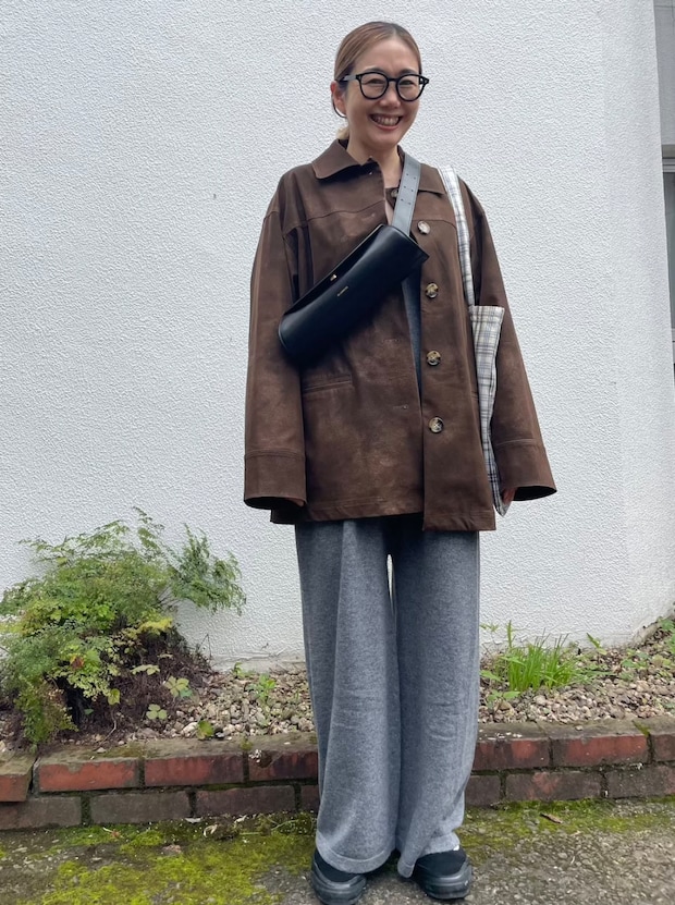 「旬色ブラウンのフェイクスエードジャケットを主役に、カジュアルなスタイリングにまとめました。リラックス感漂うニットオールインワンとスニーカーでほどよくハズしたのがポイントです」
