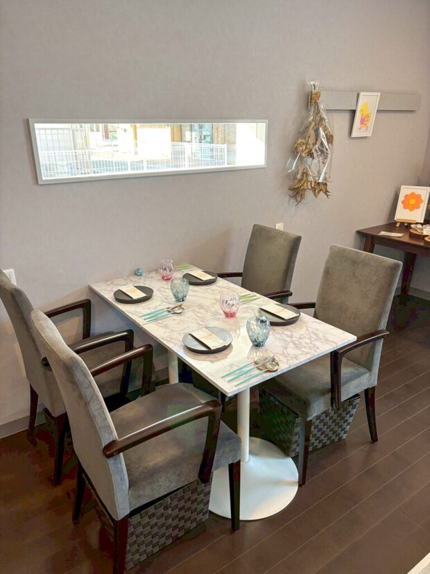 萩ガラスなどの素敵な器が並んだ、オープンカウンターの席へ案内していただきました。