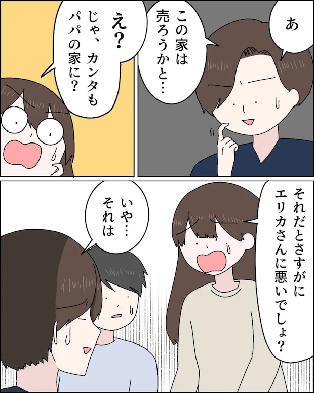 「あ、この家は売ろうかと・・と言う夫に、「え?じゃ、カンタもパパの家に?」そう言って驚いた後、「それだとさすがにエリカさんに悪いでしょ?」とジュリが言うと、「いや・・それは」とまたまた言葉を濁すケイさん。