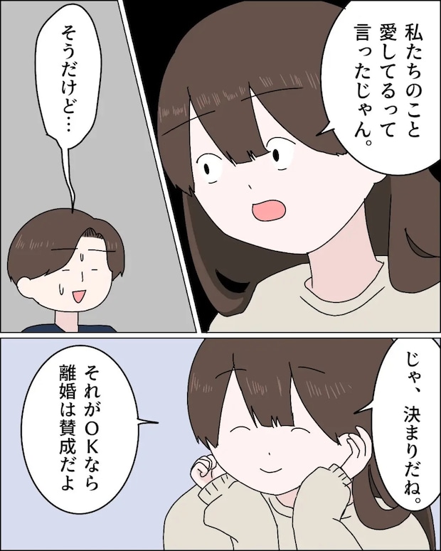 「私たちのこと、愛してるって言ったじゃん。「そうだけど・・」、「じゃ、決まりだね」それがOKなら離婚は賛成だよ」