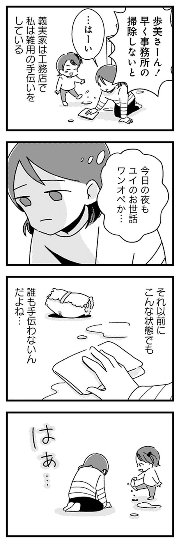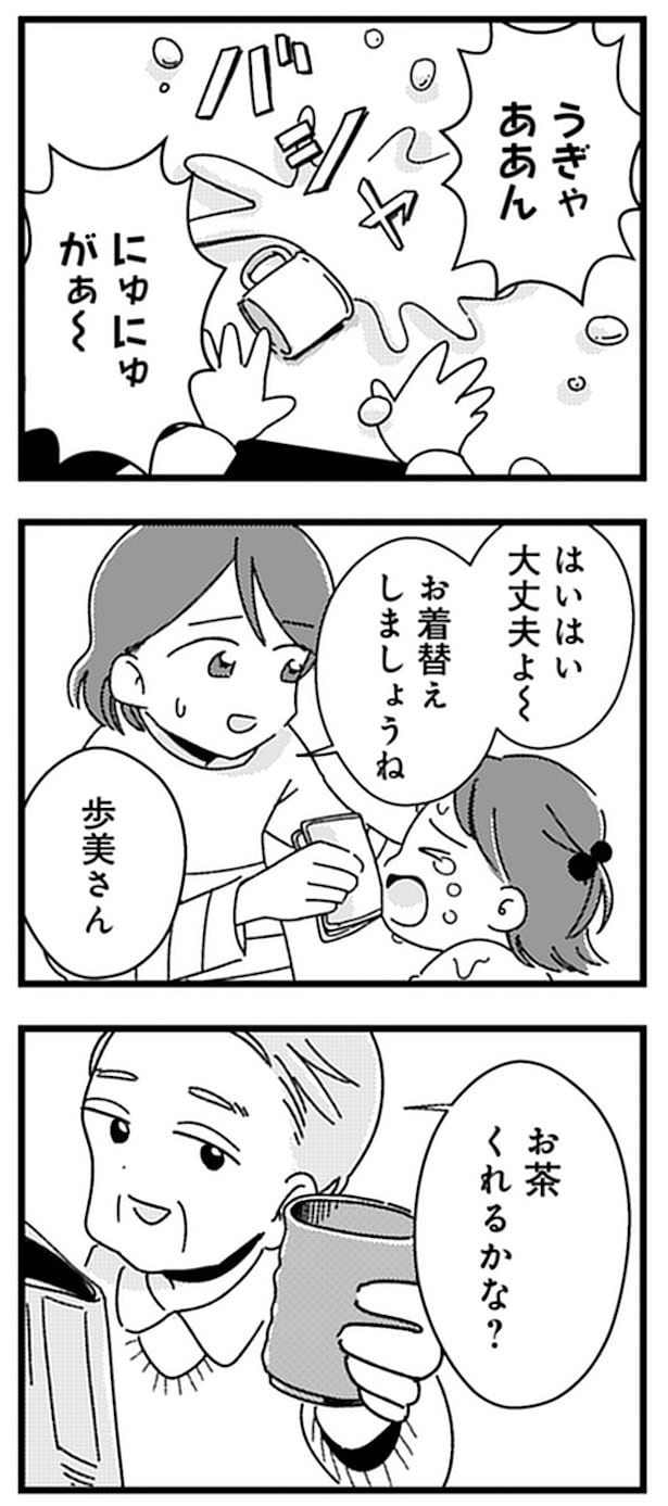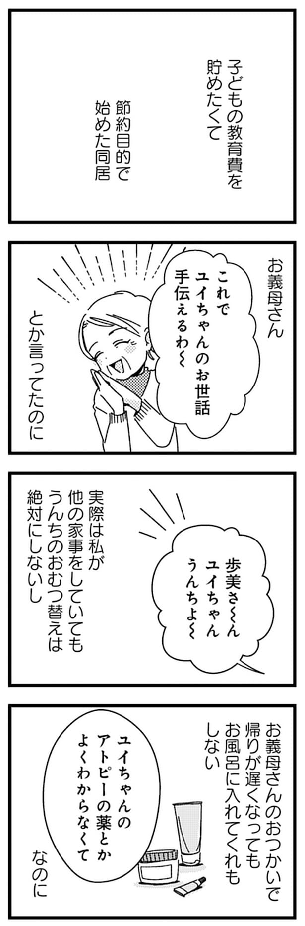 義実家で義両親と同居をする歩美。義両親や夫は子育てに非協力的で歩美は孤独に子育てをしていた。さらに義母の子育てに対する口出しに、歩美はストレスを感じ…。