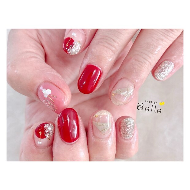 ラメやスタッズとの相性も言い深紅ネイル、