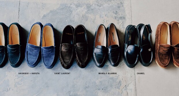 上に並ぶローファーたちは、最近の百々さんのスタメン。1年前くらいに買ったCHANELはバックスリングなデザインに惹かれて。じっくりはきこまれたMANOLO BLAHNIKのローファーは10年選手。SAINT LAURENTとSHISHIKUI×HARUTAのコラボローファーは今回はいてくれたもの。全て本人私物