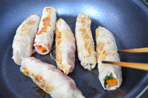 豚肉で野菜を包み込むように巻いていきましょう。