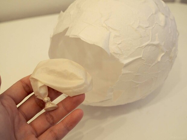 完全に乾いたら風船を割り、中から取り出します。下部の余分な部分を切り落としたら、丸いランプシェードの形になりますよ。