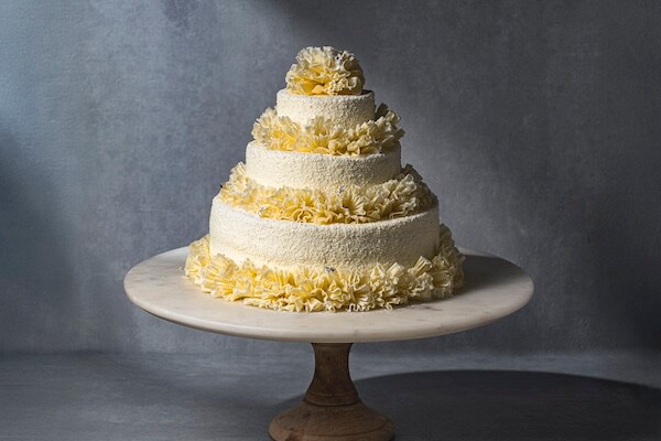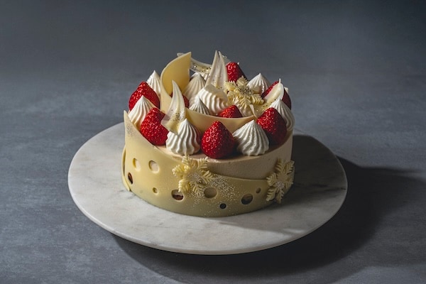 2025年のテーマは「ホワイトクリスマス」。軽やかなホワイトチョコレートのフリルをまとった、華やかな3段のクリスマスケーキで特別なひと時を過ごすことができる。