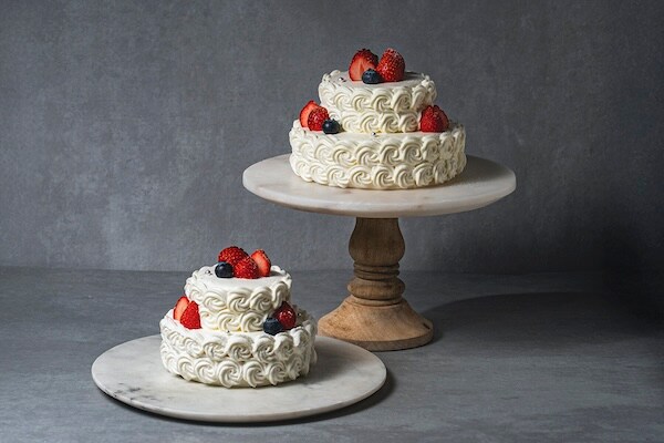 価格は4号サイズが¥4,320(税込)、5号サイズが¥5,616(税込)。サイズは4号の下段が直径約12cm×高さ約5cm、全体の高さが約12cm、5号の下段が直径約16cm×高さ約5cm、全体の高さが約12cmとなっている。
