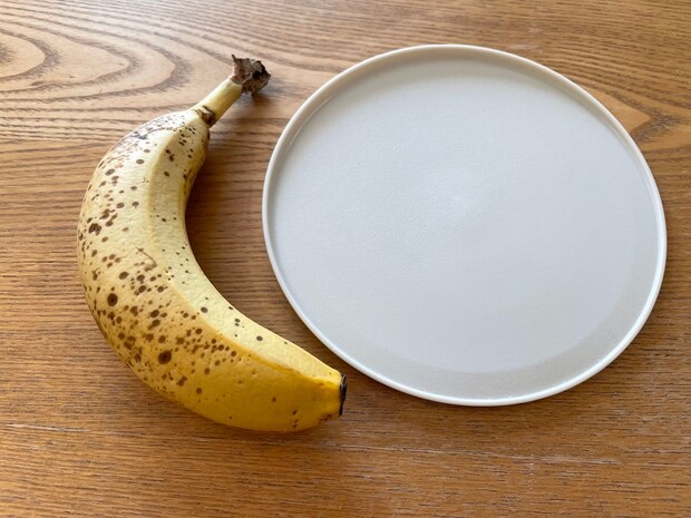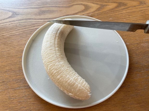 まずは、まな板を使わずお皿の上で切りがちなバナナをカットしてみます。