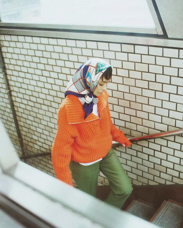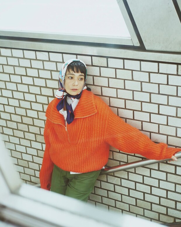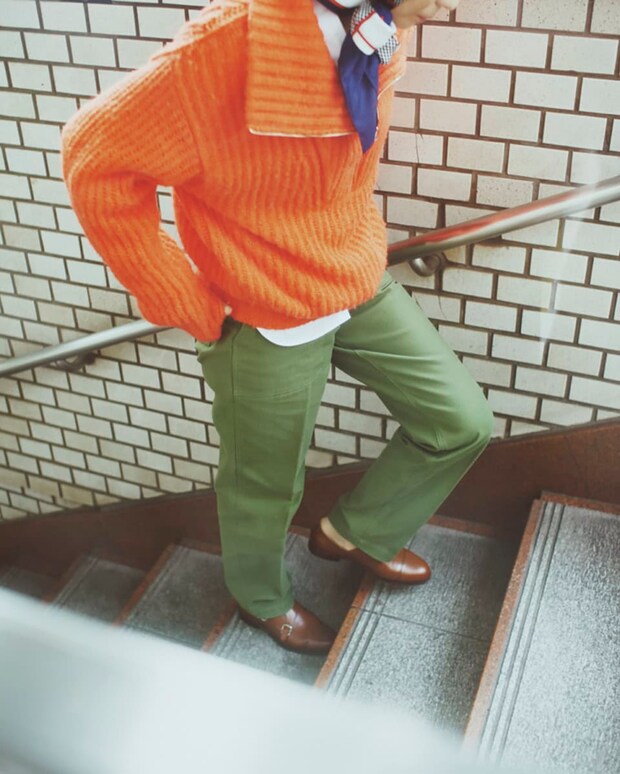 鮮やかなオレンジが目を引くハーフジップニットには、ブランドのロングセラー、ベイカーパンツをチョイス。どこかワークムードも漂うスタイルながら、スカーフを巻いて茶目っ気を、硬派なレザーシューズできちんと感も意識したシンゾーンらしいMIXコーデに。