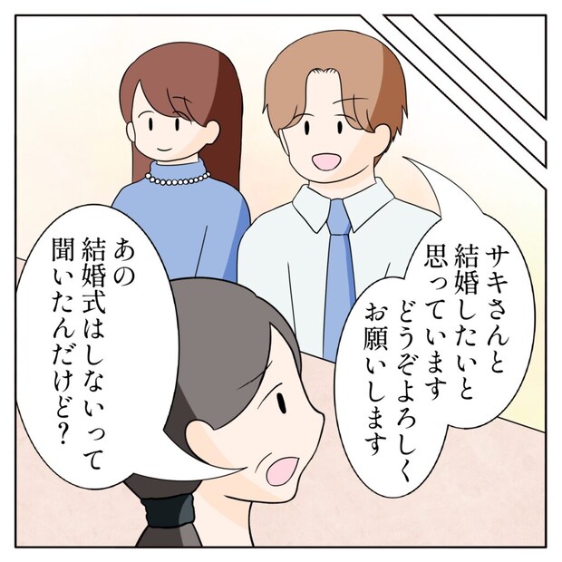 結婚式を挙げないとアキラさんと2人で決めたので、サキさんは食事会を開いて両親にアキラさんを紹介しました。するとお母さんは次々と失礼なことを言い始めたため、お父さんもサキさんもお母さんを止めます。お母さんは、アキラさんの収入が安定していないのでシュウトさんに迷惑がかかるのではないかと心配していたのです。サキさんは、やはりお母さんの頭の中にはシュウトさんだけなのだなと思いました。