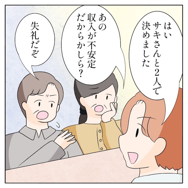 アキラが「はい、サキさんと2人で決めました」と答えると「あの、収入が不安定だからかしら?」と母が躊躇なく聞いたので、さすがに父が「失礼だぞ」と遮りました。