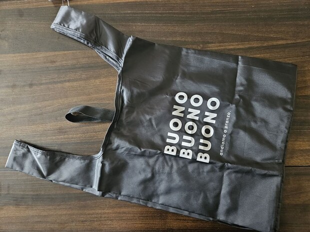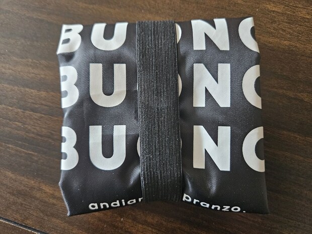 次はランチエコバッグです。220円(税込)です!ゴムバンドが一体化されているので、折りたたんでバンドでとめることができます。