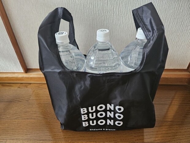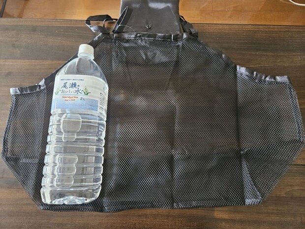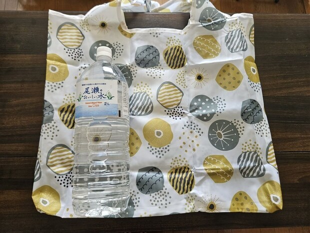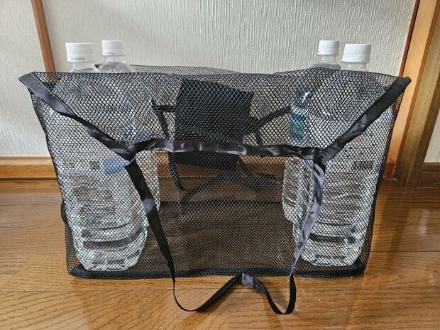 材質はポリエステルでできていますが、メッシュ構造と持ち手はかなりの細さなので2Lの水1本でも少々不安があります。