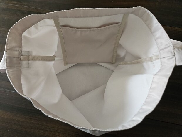 材質はポリエステルで手持ちの部分はバッグ本体との布の境界がなく、しっかり感のある生地のため、ある程度の重量には耐えられそうです。