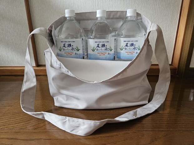 手持ち部分を肩にかけて、2Lの水4本をそのまま持ち運んでも問題なさそうです♪