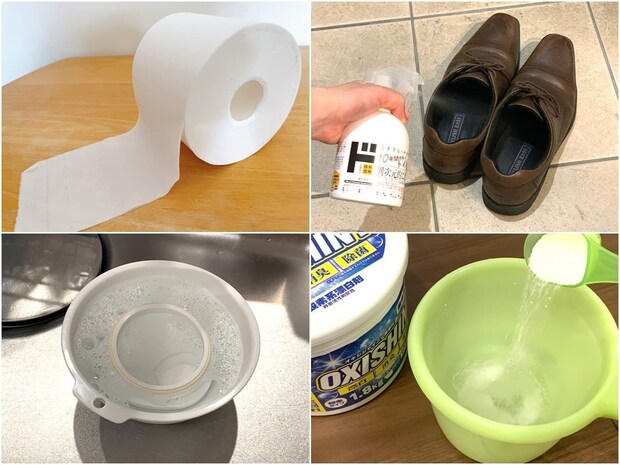 使用時はオキシシャイニーと混ぜ合わせたお湯を玄関の床にかけ、5~10分浸けておきます。