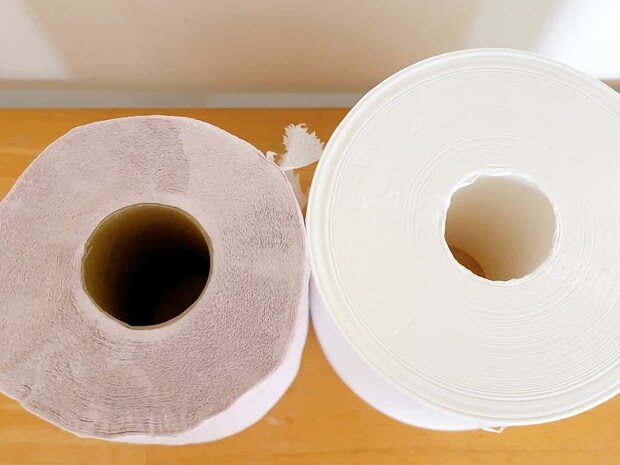 家にあった一般メーカーのトイレットペーパーと比較してみたところ、密度が全く異なりました。一般的なトイレットペーパーはふんわりした印象で隙間がありますが、ドンキのトイレットペーパーはぎゅうぎゅうに詰まっており、隙間もほとんど見えません!