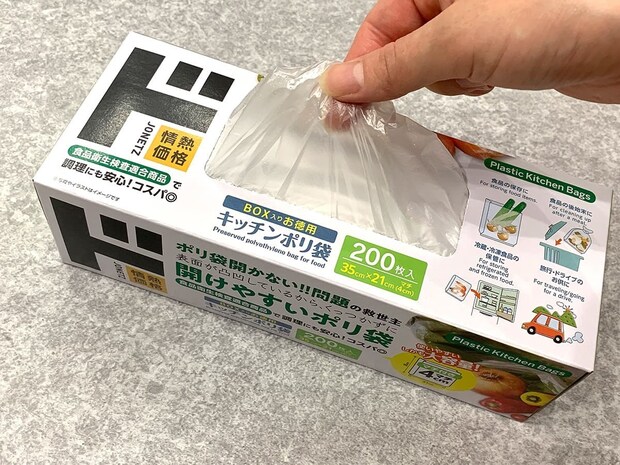 ドドンと200枚のポリ袋が入って、価格は217円(税込)とリーズナブル!キッチン以外でも、ちょっとした小物を収納したりアウトドア時のゴミ袋に使用したり、車内の簡易ゴミ袋にしたりと…多用途で役立つので1つご家庭に置いておくと便利ですよ♪