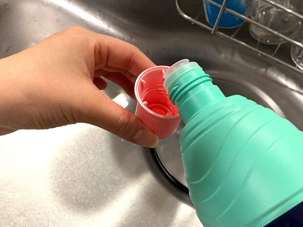 茶渋を取り除きたいときは、容器の中に水をはってキッチンブリーチを注いでいきます。1Lの水にキッチンブリーチを10ml、キャップの半分を注ぐとのことです。