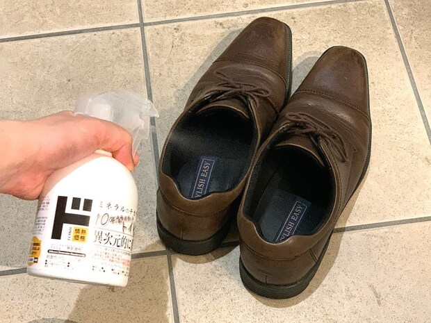 次に、主人の革靴にスプレーを使用。毎日革靴を履いて頑張ってくれている反面、やはり臭いは気になるもの…。