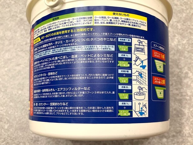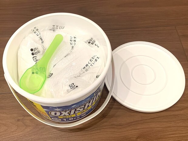 玄関の床の汚れが気になっていたので、筆者は玄関にオキシシャイニーを使用することに。容器の蓋を開けると、たっぷりの漂白剤とスプーンが入っていました。