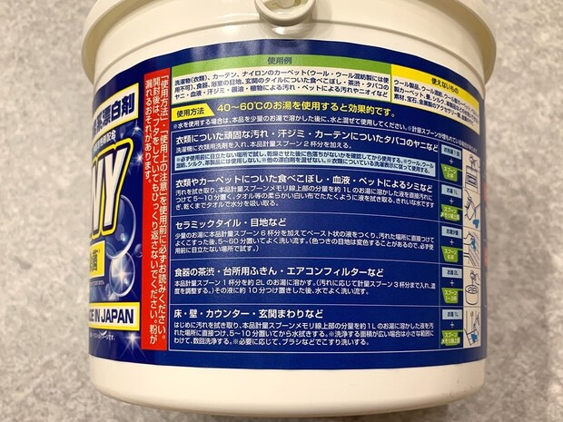 漂白の他、消臭・除菌の効果も持つ本品。衣類やカーテンに付いた汚れ、タバコのヤニ、セラミックタイル・目地の汚れ、食器の茶渋、エアコンフィルター、床・壁・カウンター・玄関周りの汚れなど、さまざまな用品・場所に使用可能となっています。