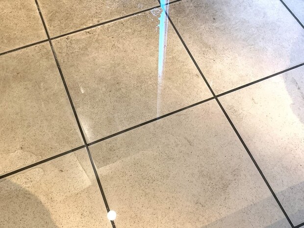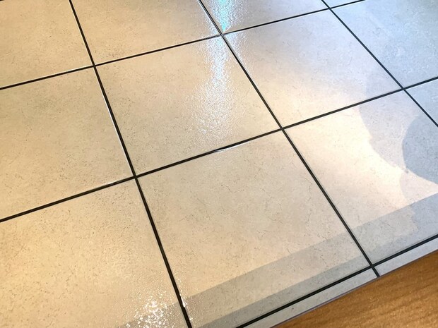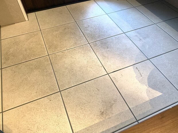 オキシシャイニーで掃除を終えた玄関の床がこちらです。黒い汚れが落ち、掃除前と比較するとかなり綺麗になったのではないでしょうか!?