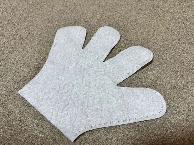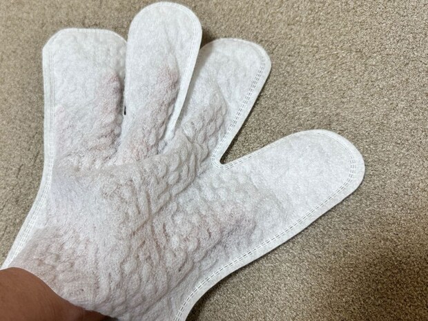 ふわふわした素材で作られており、ホコリを絡め取りやすい凹凸の形状をしているのが特徴的。クイックルワイパーの手袋バージョンのような印象でした。