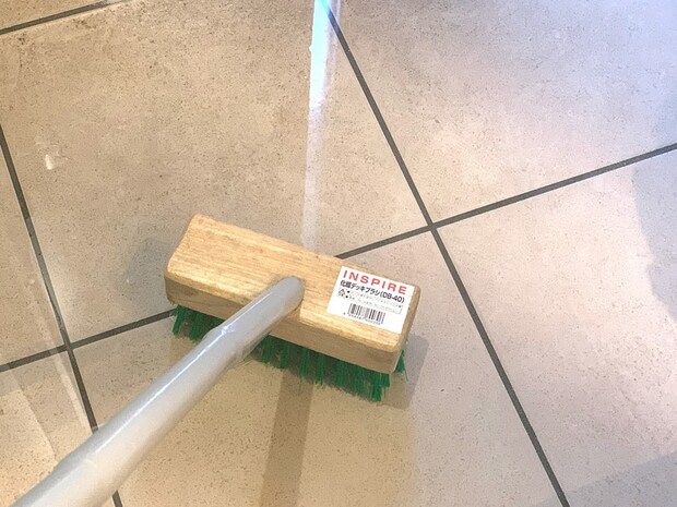 「必要に応じてブラシなどでこすり洗いする」と記載もあるので、デッキブラシでこすっていきます。さすがに床の頑固な汚れとなると、オキシシャイニーを浸すだけでは汚れは落ちなさそうですね。
