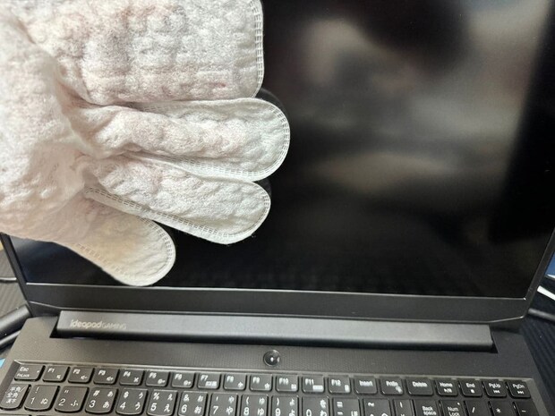 手始めに、ノートPCの画面を拭いてみました。よく見るとホコリが付着しているノートPCですが、ササッと綺麗になりました♪