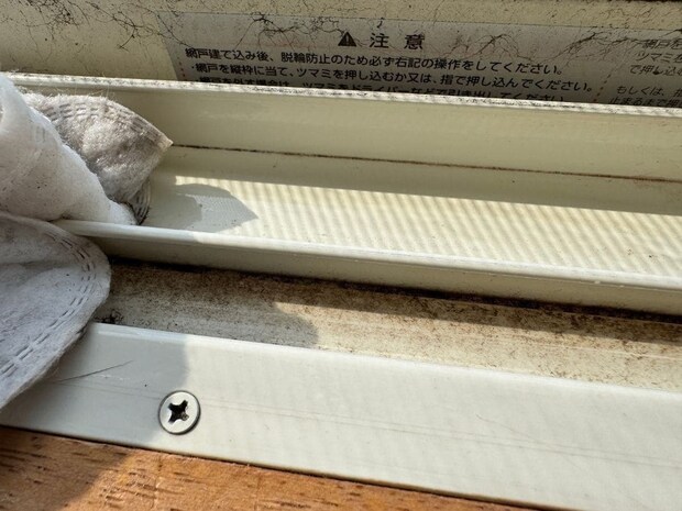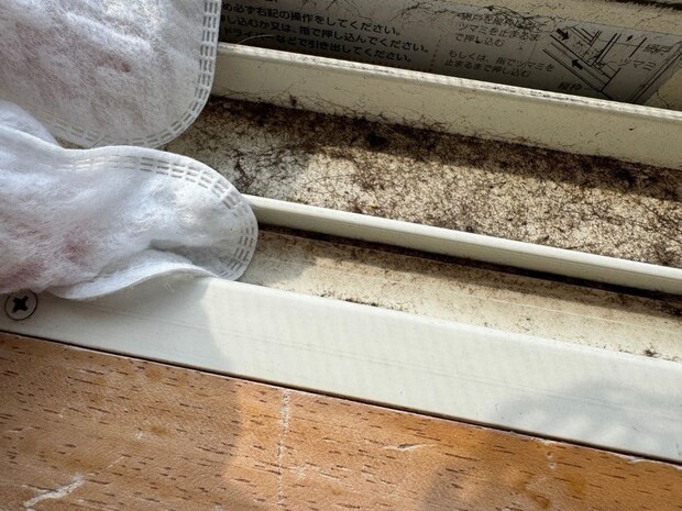 次に、頑固汚れにも使えるか検証すべく、窓のサッシ部分を拭き取ってみることに。お目汚しすみませんが、年末の大掃除でスルーしてしまったため汚れがかなり溜まっています…。