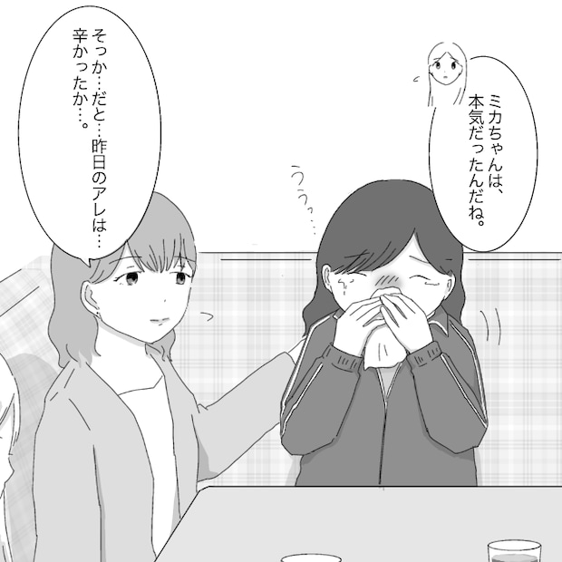 「ミカちゃんは本気だったんだね」「そっか・・・だと昨日のアレは辛かったか」レンに利用されていたと知らず、本気で好きになってしまった私の気持ちを汲んで、優しく寄り添ってくれる2人。レンにフラれてひどく傷ついた心が、少しだけ回復したような気がしました。