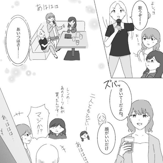 その後は、好きな歌を思いっきり歌ったりレンの愚痴を言い合ったりして、時間が経つのを忘れるほど楽しみました。途中、レンのスーツを私が買ったことを打ち明けると、2人はお腹を抱えて笑っていました。
