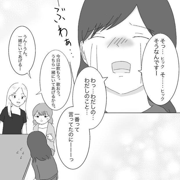「私のこと、一番って言ってたのにー!」今まで我慢していた感情が一気に溢れ出しました。わんわん声を上げて泣く私に、2人は「今日は飲もう、歌おう!うちら一緒にいてあげるから」「うん!一緒にいてあげる」と優しく声をかけます。