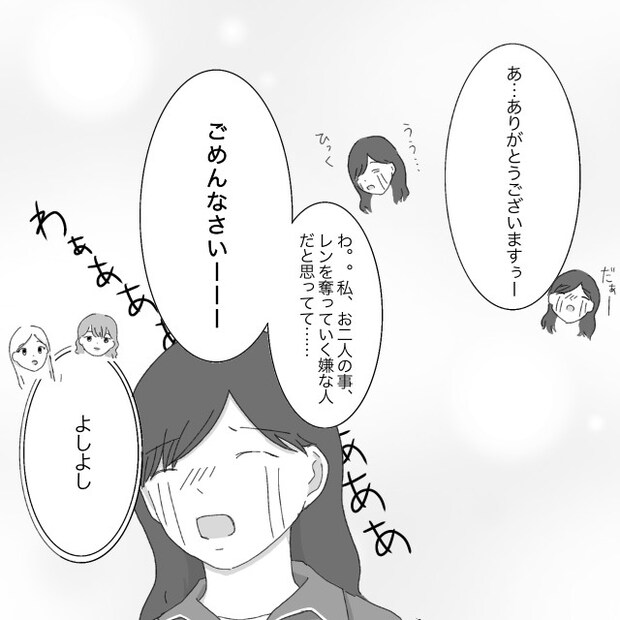 ほとんど初対面にもかかわらず、話を聞いて元気づけてくれる2人。レンに連れられて初めてバスケサークルに来たとき、2人のことをレンを奪っていく嫌な人だと思っていた自分が恥ずかしくなりました。2人は、子どものように泣きじゃくる私の頭を撫でながら、「よしよし」となぐさめます。