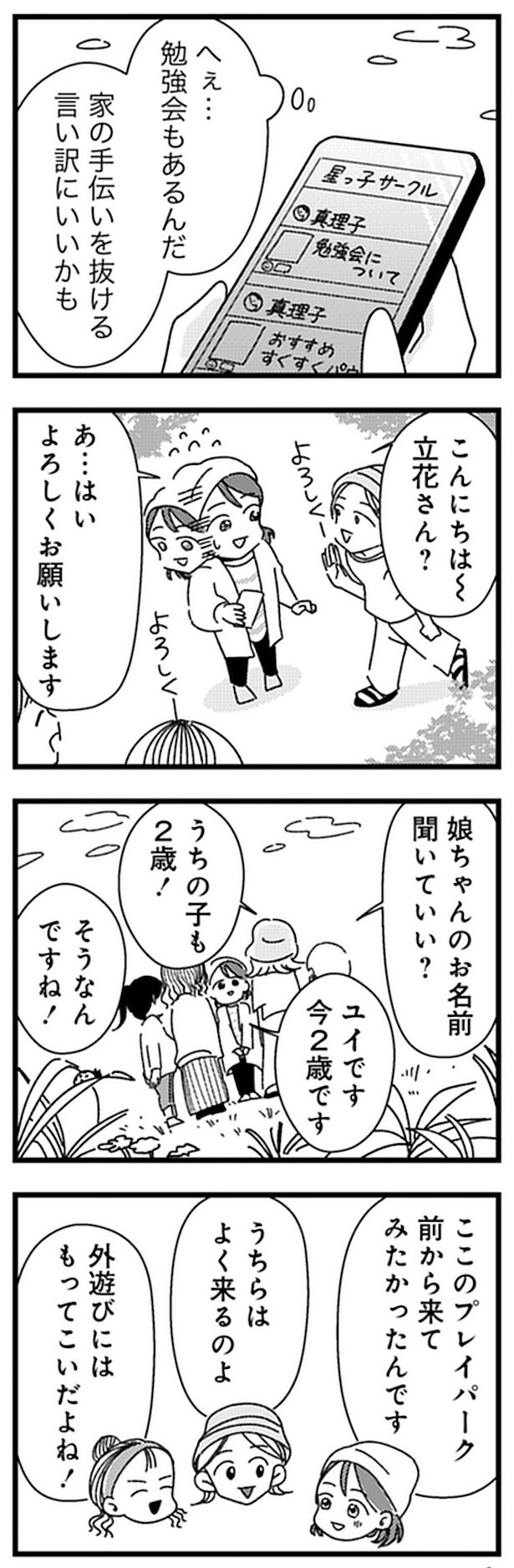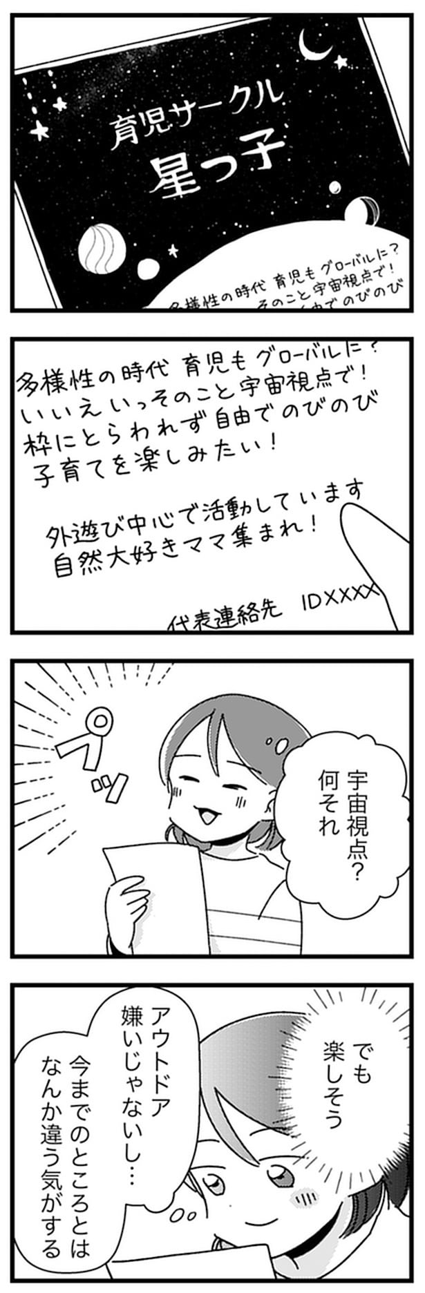 義実家で同居しながら、孤独に子育てをしていた歩美。ママ友を探すもなかなかうまく行かず、悩んでいた。そんなある日『育児サークル 星つ子』の存在を知る。試しに見学に行った歩美は、「宇宙育児」というスケールの大きな方針を聞き、今まで知らなかった育児知識に触れ、自分の居場所を見つけたと感じる。そこに集まっていたのは、“自然派”な生活を実践するママたち。怪我した子の傷口に直接アロマをつけたり、手の常在菌と付き合うため手洗いでは石鹸を使わなかったり、熱が出たら野菜を帽子にしたり――。歩美は、今まで自分の知らなかった育児知識に感銘を受け、影響されていく…。