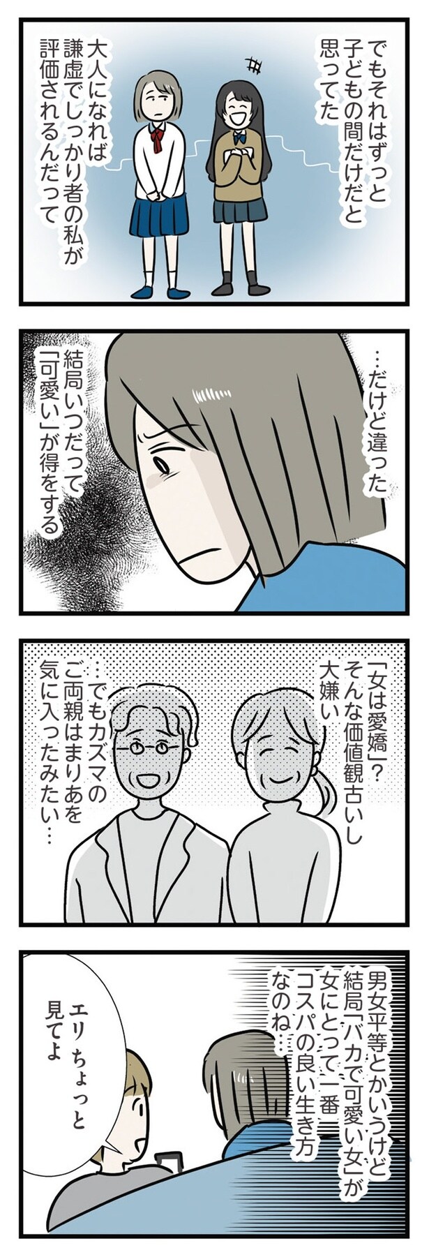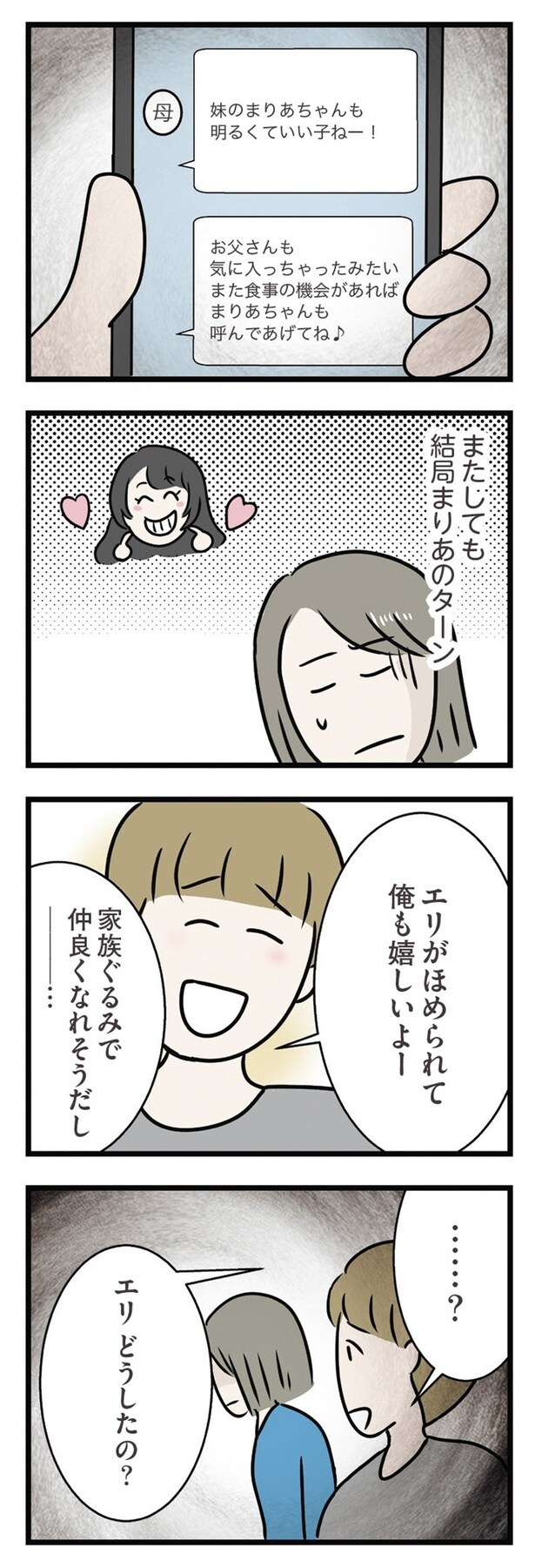 前回、両家の顔合わせで話題の中心になっていたまりあ。「女は愛嬌」だと言うけれどその通りだとエリは実感した。自分とは正反対の妹ばかりが可愛がられる事実。思わずカズマに愚痴をこぼすと…。