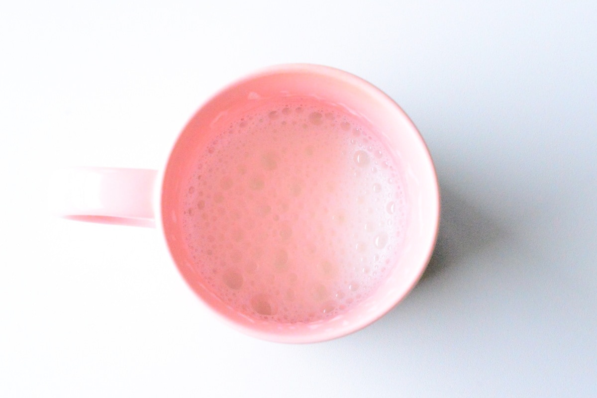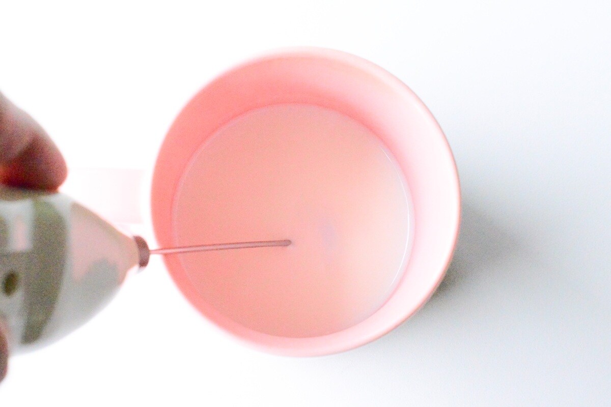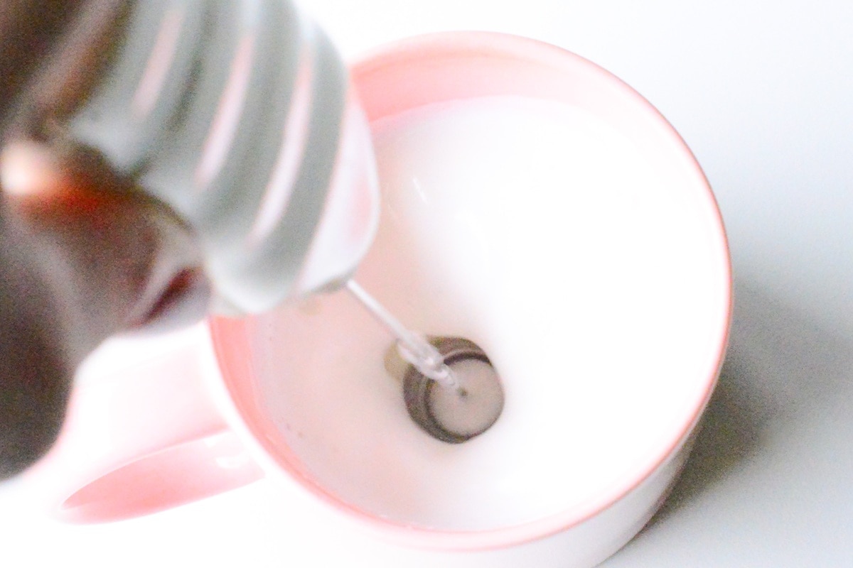 フォームミルクを作ってみます。カップの4分の1程度まで牛乳を注ぎ、電子レンジ600Wで約1分温めます。牛乳が沸騰しないように注意しましょう。