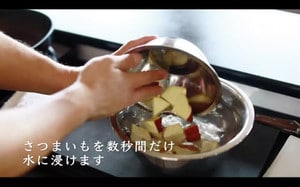 さつまいもを食べやすい大きさに切り、水にサッとさらします。
