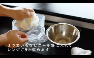 キッチンペーパーを湿らせます。これでさつまいもを包み、耐熱容器に入れて電子レンジで加熱します。
