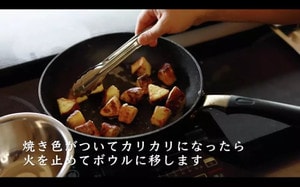 フライパンに油を熱し、片栗粉をまぶしたさつまいもを加えて焼いていきます。カリカリになるように焼きます。焼き上がったら一度取り出しておきます。