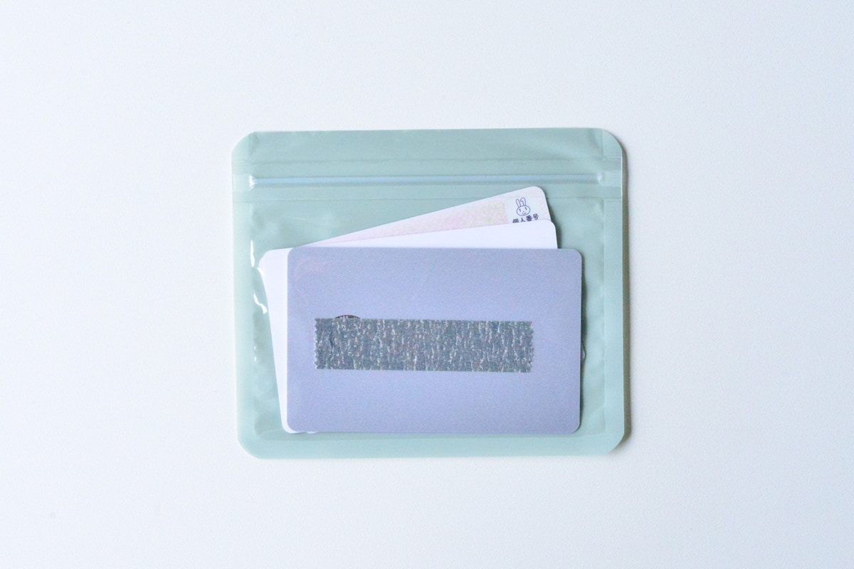 マイナンバーカードと診察券を入れてみました。こちら側からは中身がうっすらと見える程度です。