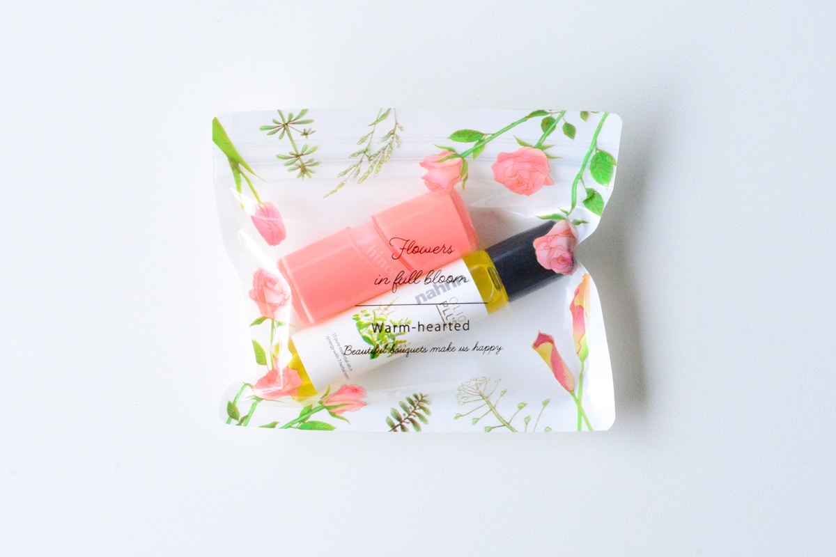 ミニサイズのリップとハーブオイルを入れてみました。ボタニカルデザインが入っている面はクリアで中身が見える仕様です。