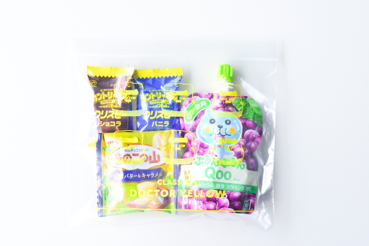 お菓子やゼリー飲料の持ち運びにもぴったり。ほかにもオムツやスタイ、肌着など、子どもとのお出かけグッズを入れるのにちょうどいいチャック付き袋です。