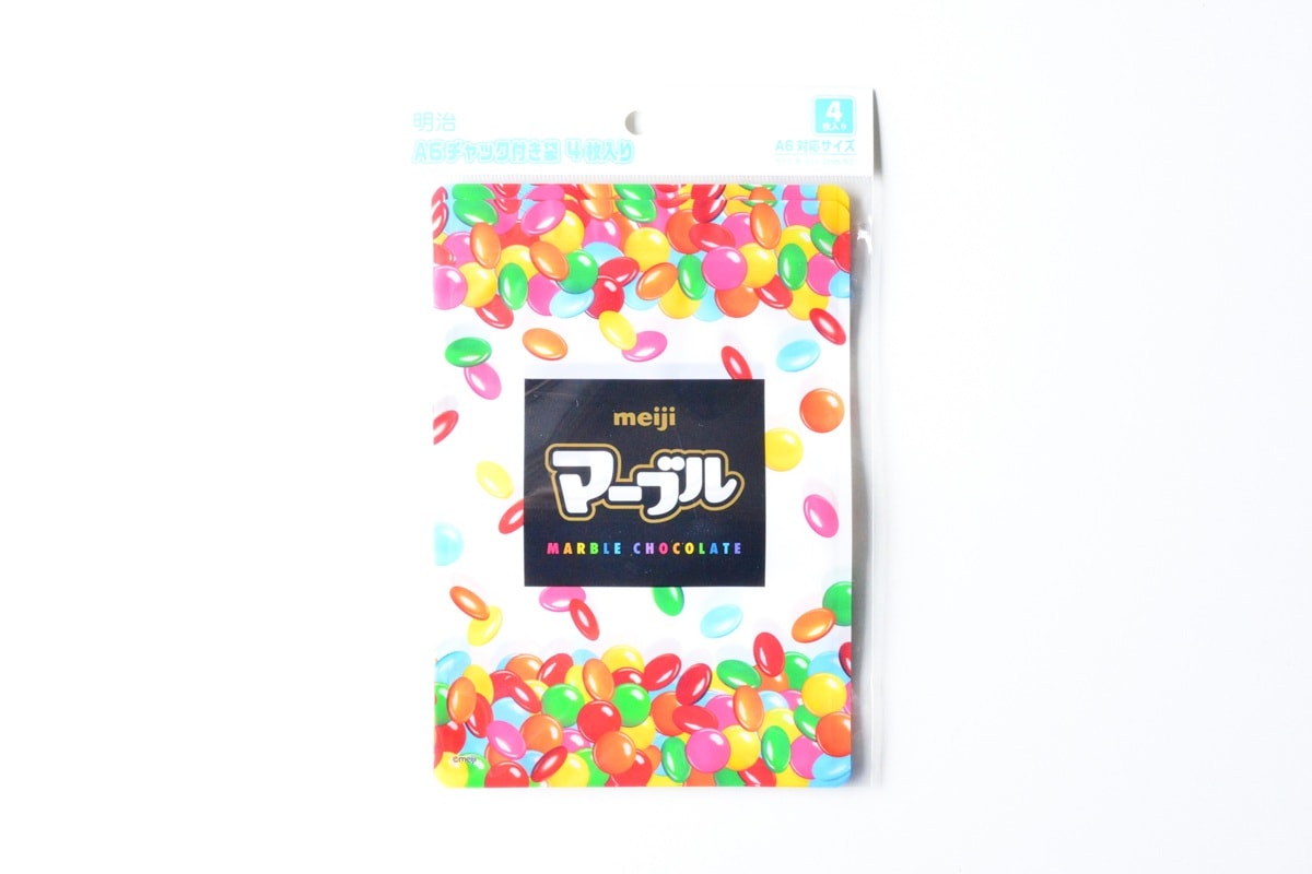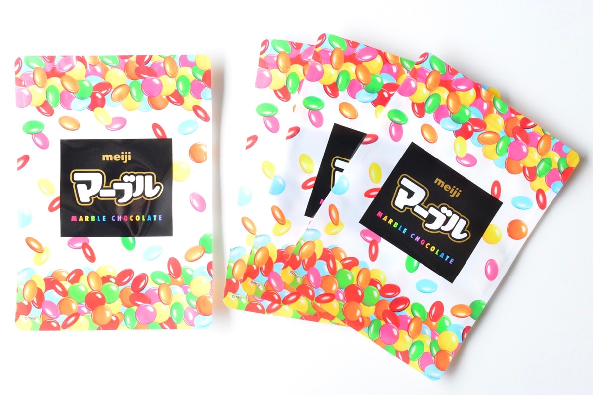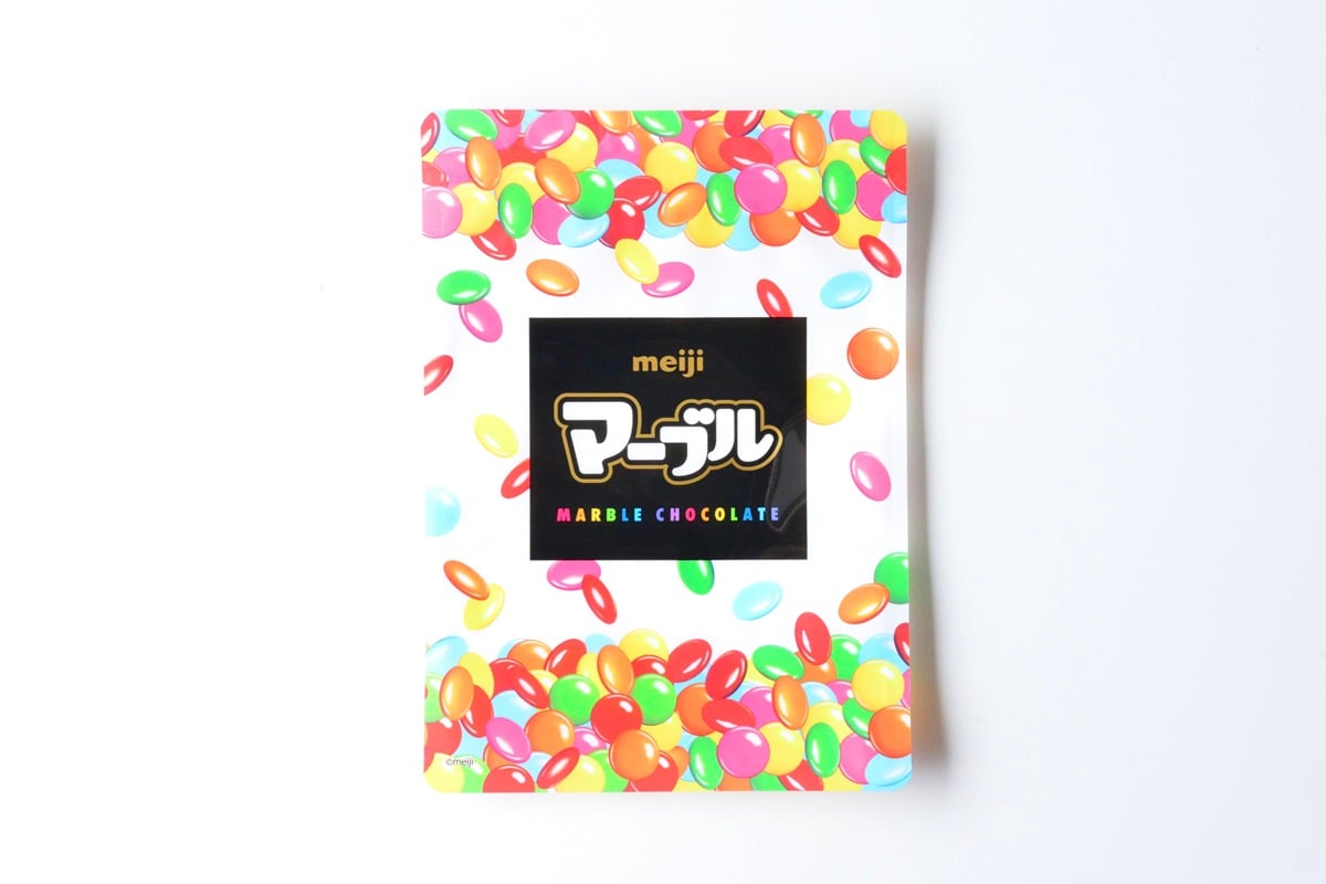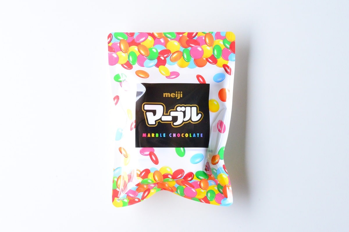 おなじみの「明治 マーブルチョコレート」のデザインです。