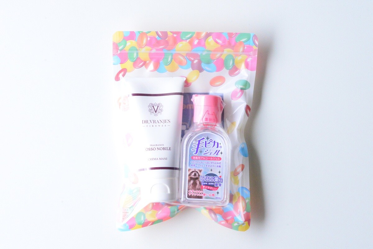 除菌ジェルとハンドクリームを入れてみました。立体的になるとなおかわいいですね。こちらの面からは中身が見えません。